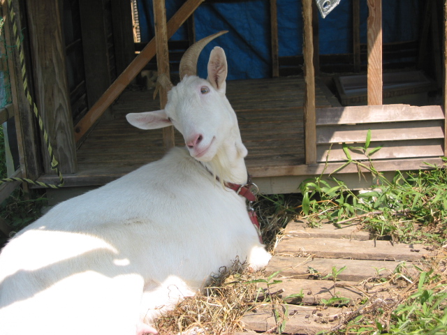 さて、我が家の場合はどうだろうか。はたして「メイ」を食べることができるであろうか。(南方へ行けばヤギも立派な肉用家畜です。)メイの顔をしげしげと見つめ、ふとそんなことを考えてしまいました。もし仮に私たちがメイを食べてしまったら、メイは私たちの中で幸せに生き続けるどころか怒り心頭、暴れまくるに違いなく、「あり得ない。」と心の中でつぶやいてしまいました。