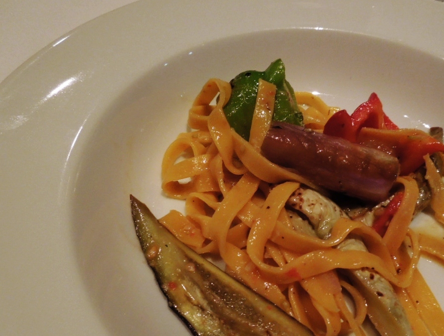 夏野菜いっぱいのタリアテッレ。我が家の自然卵「歩荷」を使った手打ちパスタ。(上写真)