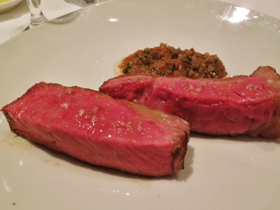 メインは赤牛、酸味が夏っぽいエシャロットのソース添え。絶妙な焼き加減は、まさに逸品。