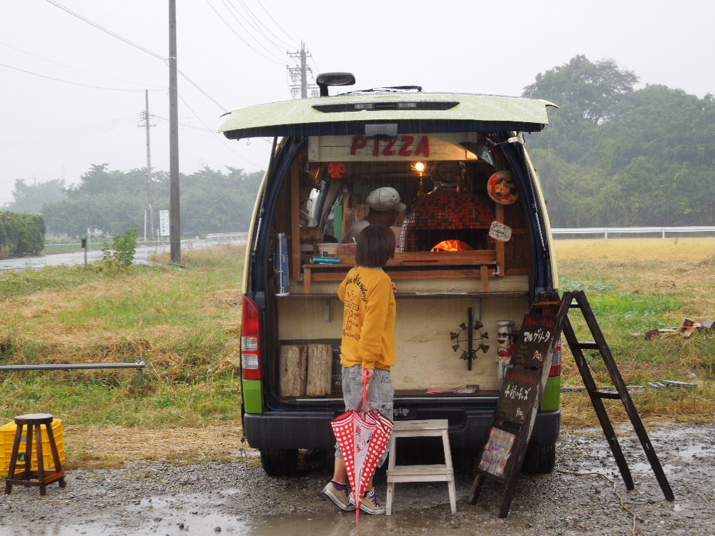 石窯PIZZA屋台「boccheno(ぼっけーの)」さん、雨の歩荷農場で開店です。