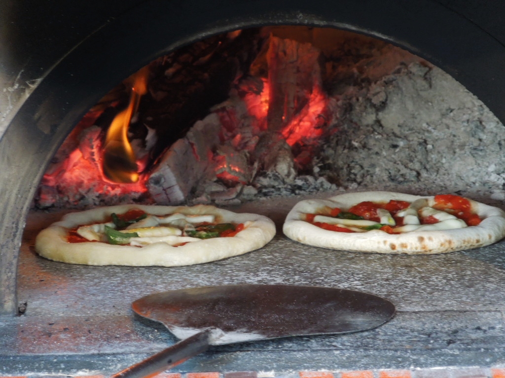 石窯の中で燃え上がる薪の力で一気に焼き上げます。