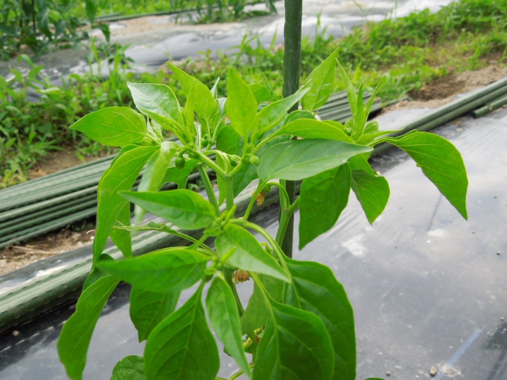 8月中旬の我が家の畑。唐辛子が赤く色づき始めました。真夏の野菜、丸オクラも絶好調。