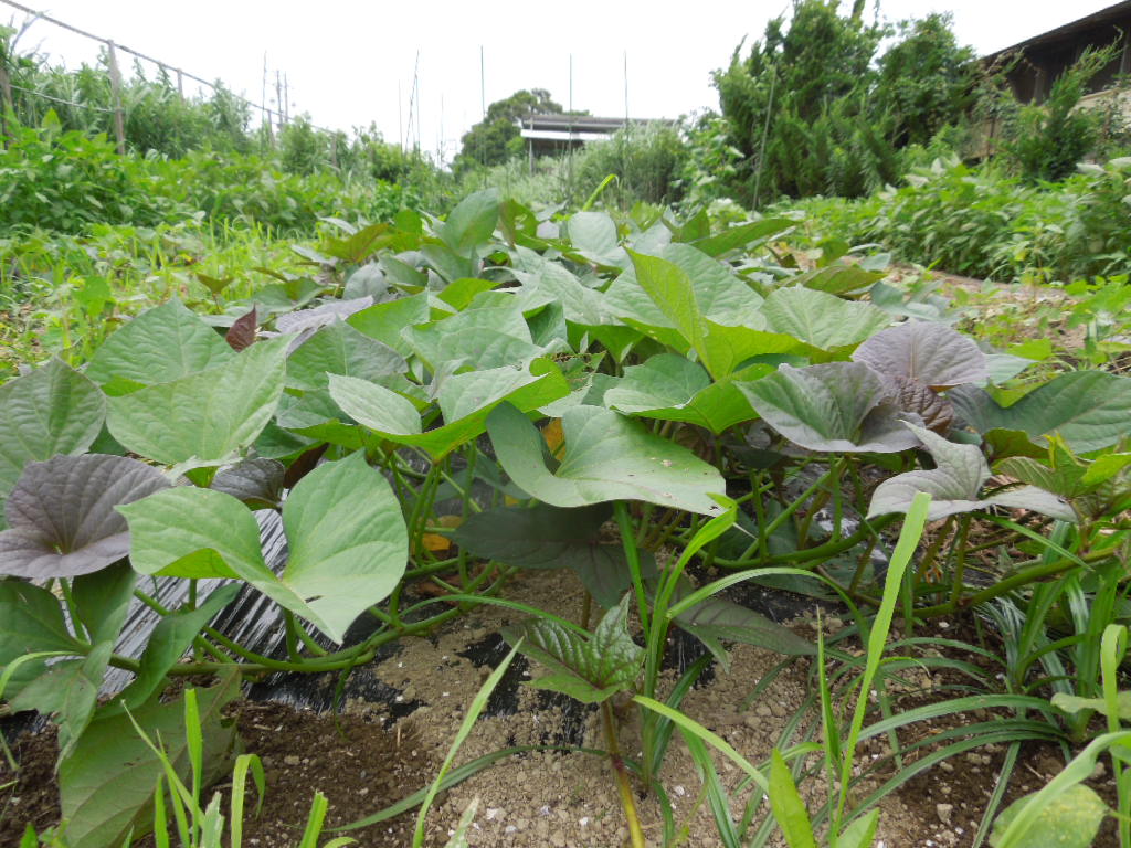 7月の我が家の畑。少しずつですが、収穫が始まりました。雨が多いので、ナスの出来は抜群です。さつま芋はもう少し先になりますが、今のところ順調。草叢の中のカボチャたち。トマトも病気、害虫全くありません。3年ぶりの唐辛子栽培。当然、キュウリも元気いっぱい。完全無農薬、肥料は我が家の鶏糞以外全く使用していない有機栽培。鶏たちの餌に薬物や合成添加物が入っていないので、土壌菌の力で醗酵した鶏糞も野菜たちの命に優しく自然な活力を与えます。大地の力と共に育む旬の露地野菜…。雑草とともに力強く育っています!