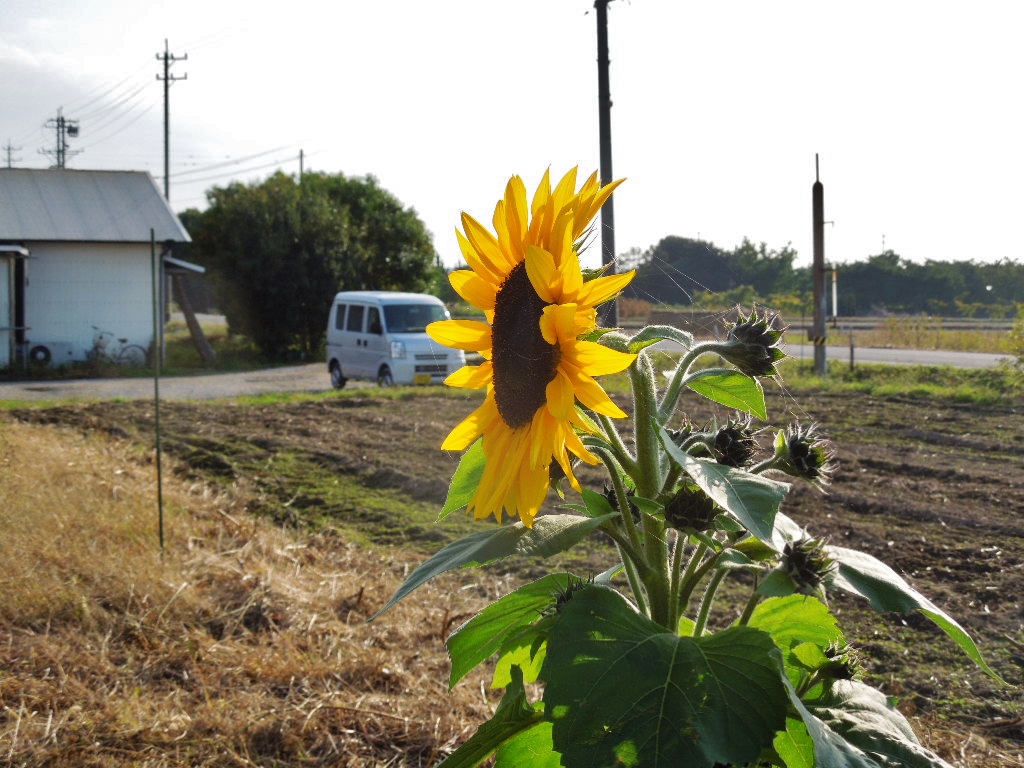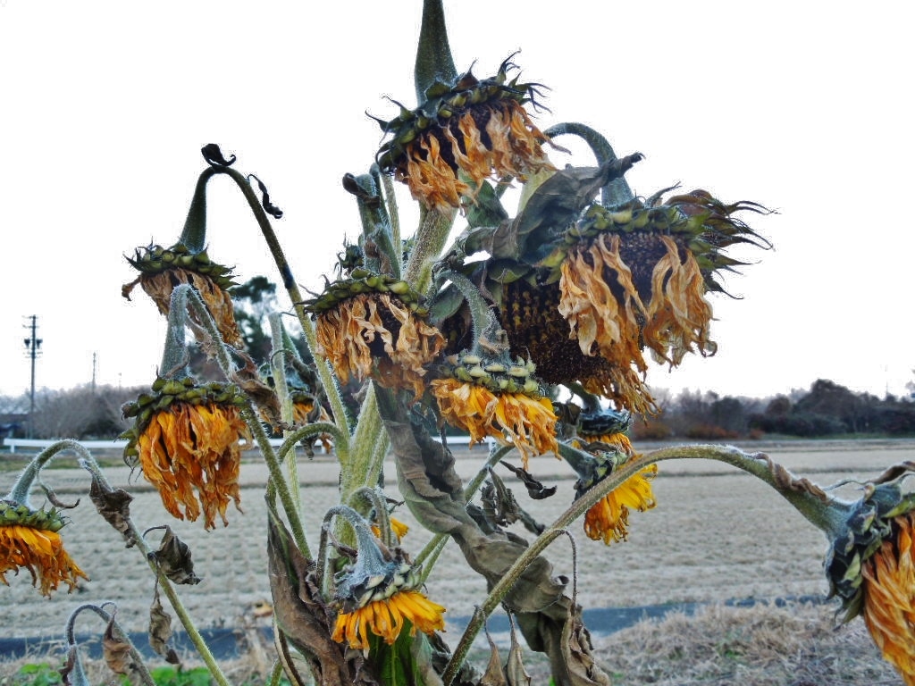 「晩秋のひまわり」。こぼれ種の一人咲き。もともとは、「大輪ひまわり」。大きな花が一つ咲くだけのはずですが、背面に小さな蕾をいくつか従え、まるで多面多臂(複数の顔と手を持った仏像) の観音様に覚醒したかのような立ち姿。季節外れに咲き誇る力強さを感じます。