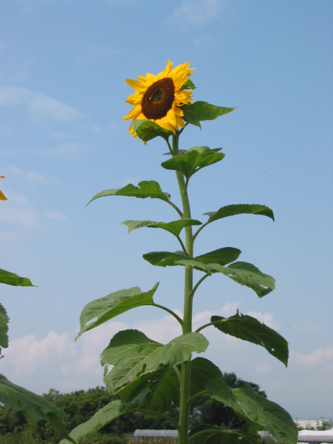 今年は梅雨が長く、まだ明けてくれません。久しぶりにほんの短い間、青空が覗きました。こぼれ種の大輪、「一番咲き」です。